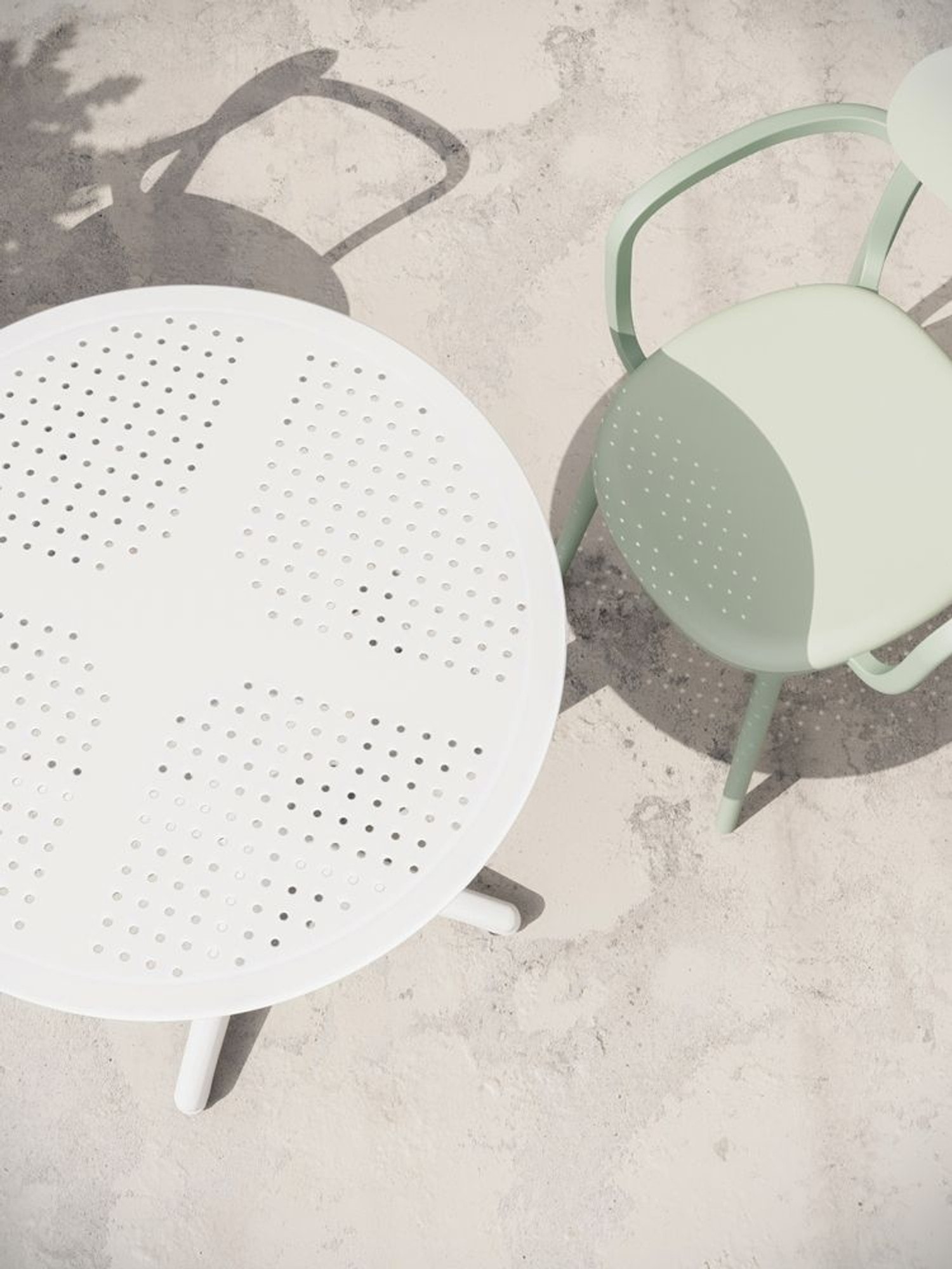 Zarif silueti ile minimal bir tasarıma sahip Rayna Masa, delikli yüzeyi ile dikkat çekiyor. Ekstrüde alüminyumdan borunun, dört çapraz ayak oluşturacak şekilde açılarak ayrılması ile kolayca istiflenebilen Rayna masa, hem iç hem de dış mekanda rahatlıkla kullanılabilir. Katlanabilir tablası seçeneği ile yer kullanımında da minimal tavrını koruyan Rayna; kompakt bir çözüm sunar